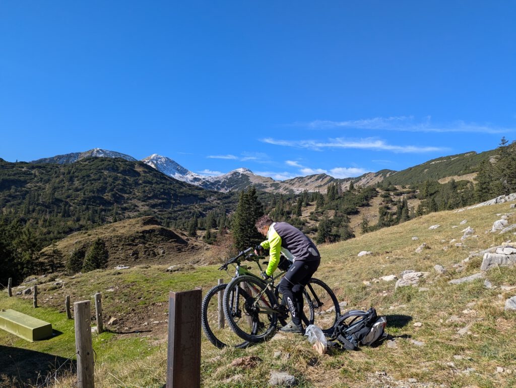Die 16 Kilometer lange Auffahrt bewältigen wir ohne Probleme. Da es heute auch angenehm kühl ist, brauchen wir auch keinen Wassernachfüllstop an einer der Kuhtränken. Auf knapp 1700 Metern parken wir schließlich unsere Fahrräder ein Stück oberhalb der Kuhalm und machen uns dann zu Fuß auf den Weg zum Gipfel der Hohen Kisten (1922m).