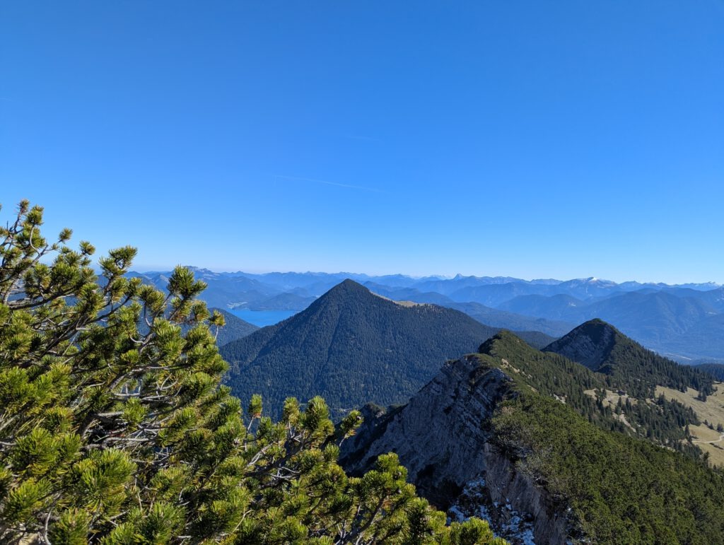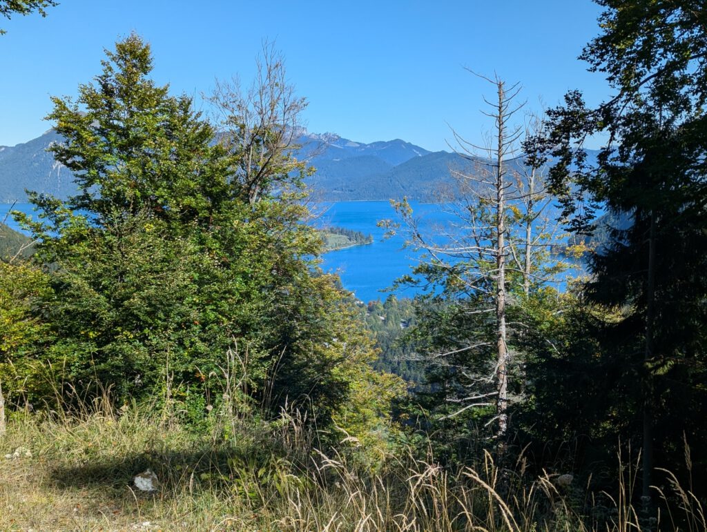 Nach ca. 800 Metern wird der Trail zum fahrbaren Karrenweg und kurz danach zu einer richtigen Forststraße. In einer Kurve halten wir kurz an und genießen den Blick auf den Walchensee.
