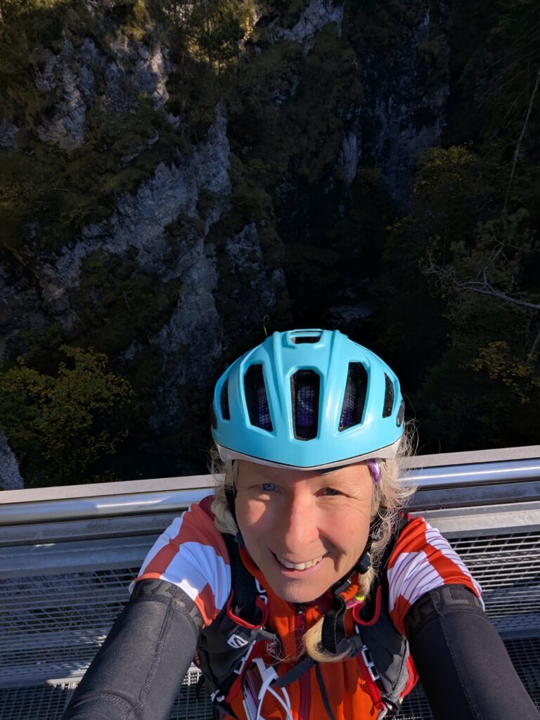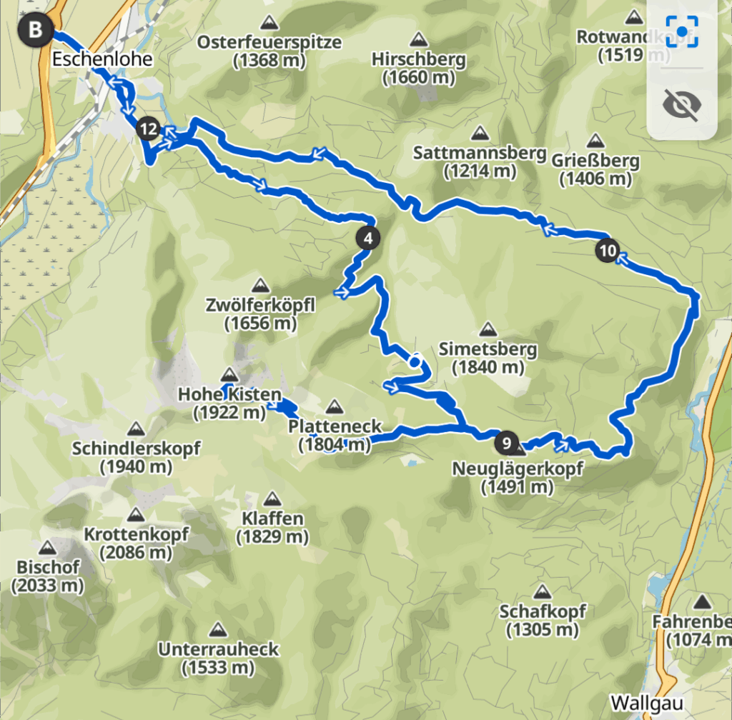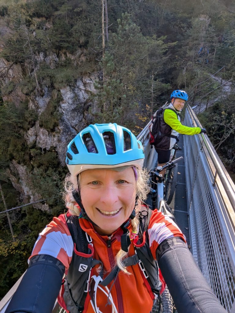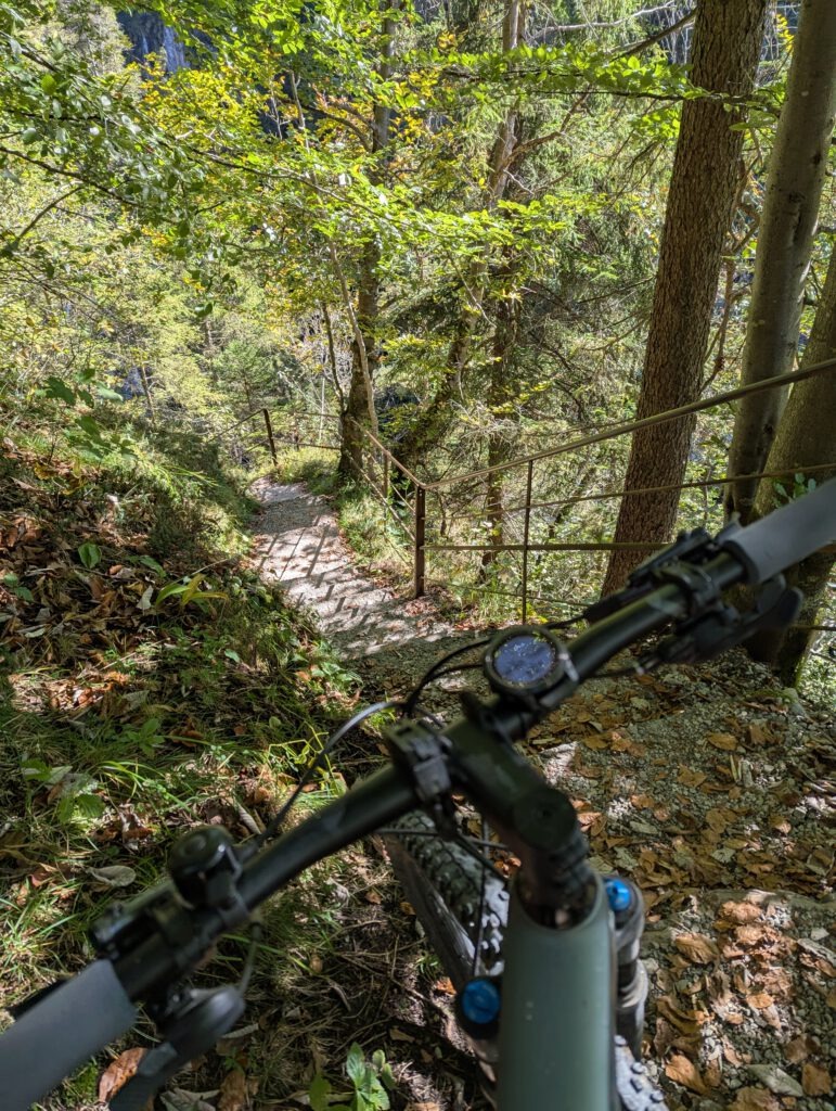 Wir schieben die Räder über die Brücke, dann die Treppen bergauf und rollen schließlich die letzten Kilometer gemütlich durch Eschenlohe zu unserem Ausgangspunkt zurück. Insgesamt sind wir heute 1334 Höhenmeter und 36,24 km gefahren.
